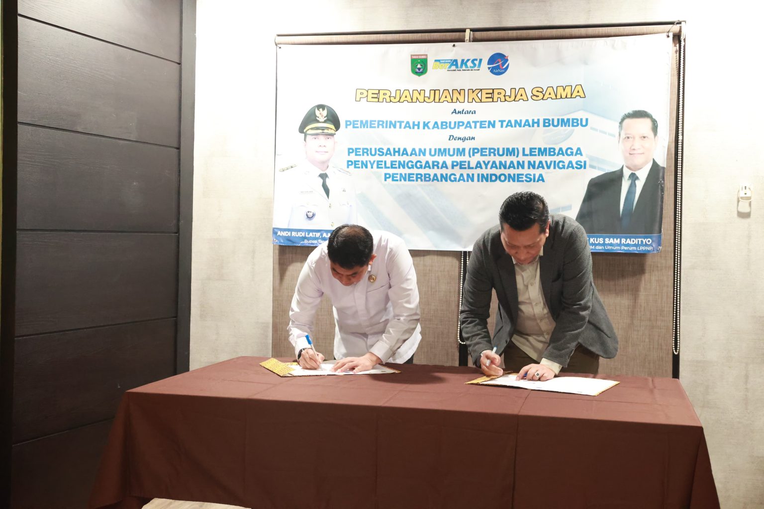BATULICIN – Bupati Andi Rudi Latif menandatangani Memorandum of Understanding (MoU) antara Pemerintah Kabupaten Tanah Bumbu dengan Perusahaan Umum (Perum) Lembaga Penyelenggara Pelayanan Navigasi Penerbangan Indonesia atau Air Nav diwakili oleh Direktur SDM dan Umum Perum LPPNPI Didiet Kus Sam Radityo, Kamis (24/7/2025) di Banjarmasin.