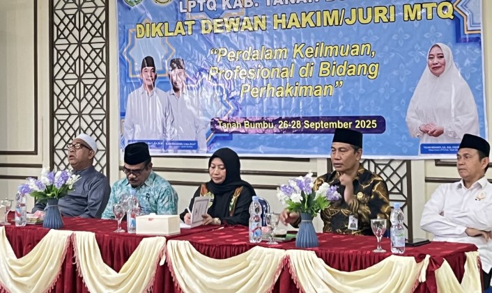 BATULICIN – Dalam pembukaan Diklat Dewan Hakim MTQ Tanah Bumbu Tahun 2025 yang digelar di Hotel Medina, Kecamatan Kusan Hilir, Jumat (26/9/2025), Bupati Andi Rudi Latif melalui Sekretaris Daerah Yulian Herawati menyampaikan bahwa majelis perhakiman bukan hanya lembaga penilai, tetapi juga bagian dari dakwah yang menyiarkan dan menghidupkan nilai-nilai Al-Qur’an.
