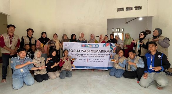 Juga dilaksanakan sosialisasi pencegahan stunting dan pengenalan produk olahan ikan. Mahasiswa memperkenalkan nugget ikan sebagai produk inovatif. Warga desa antusias dan meminta ada pelatihan pembuatan nugget sebagai peluang usaha baru.