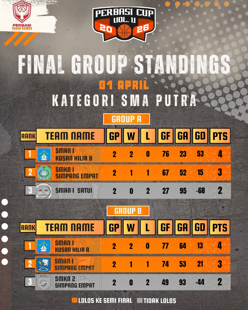 Pada kategori SMA putra pertandingan kini telah memasuki babak semifinal yang akan digelar pada Kamis malam. hasil klasemen akhir fase grup menunjukkan persaingan yang cukup ketat. Dari Grup A, SMAN 1 Kusan Hilir B tampil dominan dengan dua kemenangan tanpa kekalahan, disusul SMKN 1 Simpang Empat di posisi kedua. Keduanya memastikan langkah ke babak semifinal. Sementara itu di Grup B, SMAN 1 Kusan Hilir A dan SMAN 1 Simpang Empat berhasil mengamankan posisi dua besar dan melaju ke semifinal setelah menunjukkan performa konsisten sepanjang fase grup.