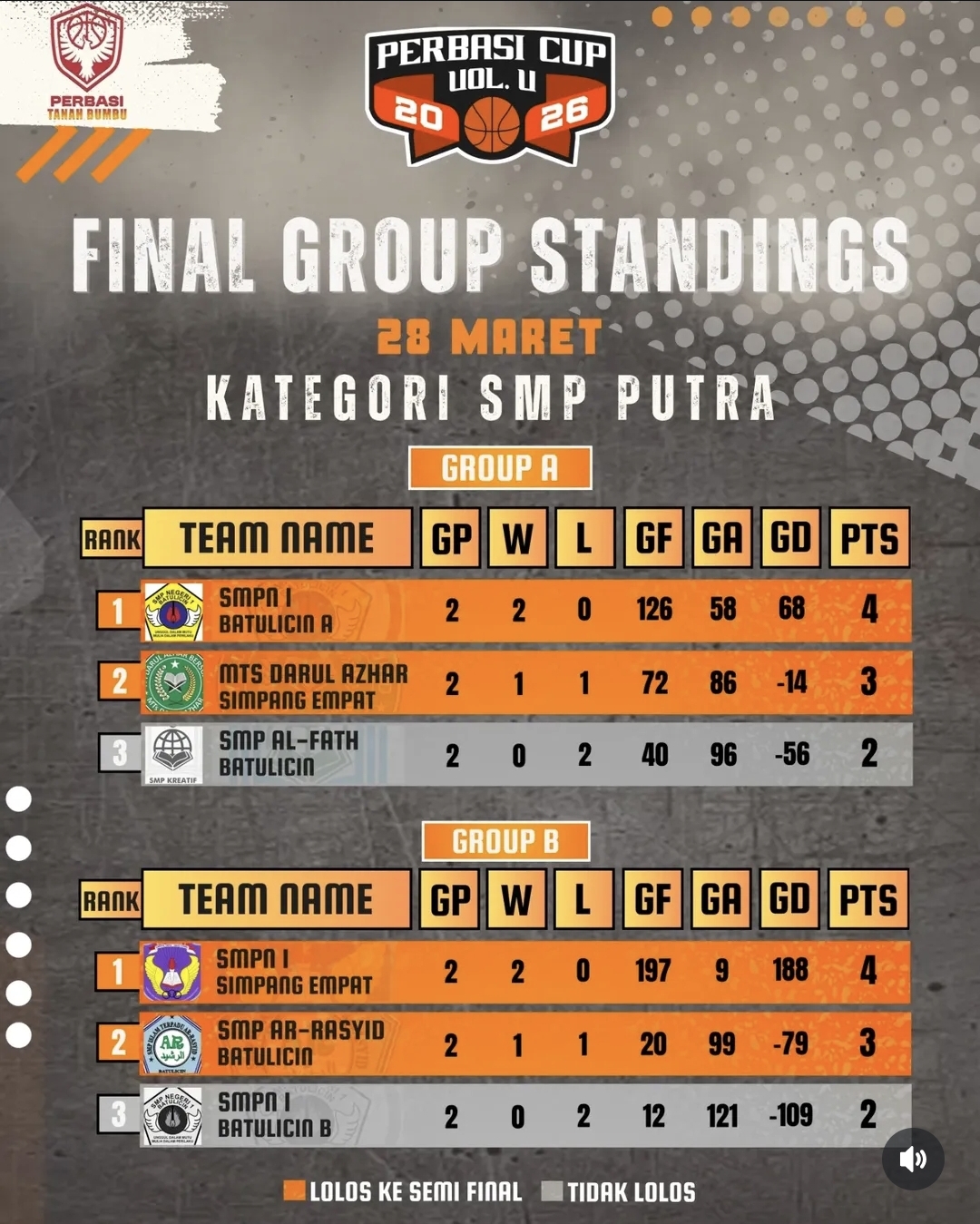 Kejuaraan basket antar pelajar PERBASI Cup Vol. V Tahun 2026 di Kabupaten Tanah Bumbu kini memasuki fase penentuan. Kategori SMP putra dan putri serta SMA putri dipastikan telah mencapai babak final, sementara kategori SMA putra tengah bersiap menjalani babak semifinal.