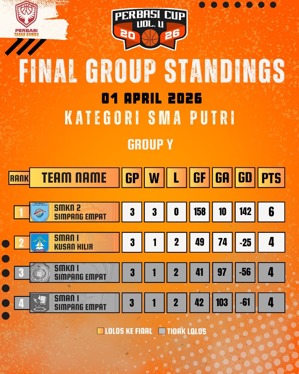 Memasuki kategori SMA putri, berdasarkan hasil klasemen, SMKN 2 Simpang Empat tampil impresif dengan catatan sempurna dan memastikan diri melaju ke partai puncak. Mereka akan menghadapi SMAN 1 Kusan Hilir yang berhasil mengamankan posisi kedua klasemen. Partai final kategori SMA Putri diprediksi berlangsung menarik, mengingat kedua tim memiliki kekuatan dan semangat juang yang tinggi sepanjang turnamen.