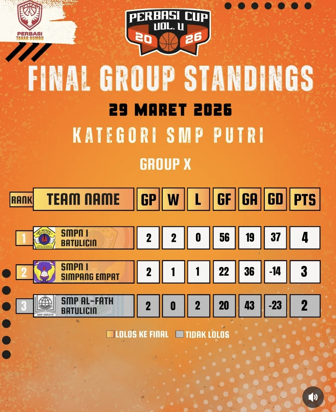 Sementara pada kategori SMP Putri, SMPN 1 Batulicin dan SMPN 1 Simpang Empat juga menunjukkan performa terbaiknya hingga memastikan tempat di partai final.